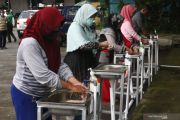 Sejumlah pedagang dan pengunjung mencuci tangan di wastafel di Pasar Induk Osowilangun Surabaya (PIOS), Surabaya, Jawa Timur, Sabtu (28/3/2020). Manajemen Pasar Induk Osowilangun Surabaya (PIOS) selain memasang 20 unit tempat cuci tangan (wastafel) dan 50 botol besar 'hand sanitizer' di sejumlah titik di lokasi PIOS juga membagikan sekitar 400 botol kecil 'hand sanitizer' kepada para pengunjung pasar tersebut sebagai upaya untuk mencegah penyebaran virus Corona (COVID-19). ANTARA FOTO/Didik Suhartono/hp.