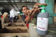 Pedagang menggunakan 'hand sanitizer' untuk membersihkan tangannya di Pasar Induk Osowilangun Surabaya (PIOS), Surabaya, Jawa Timur, Sabtu (28/3/2020). Manajemen Pasar Induk Osowilangun Surabaya (PIOS) selain memasang 20 unit tempat cuci tangan (wastafel) dan 50 botol besar 'hand sanitizer' di sejumlah titik di lokasi PIOS juga membagikan sekitar 400 botol kecil 'hand sanitizer' kepada para pengunjung pasar tersebut sebagai upaya untuk mencegah penyebaran virus Corona (COVID-19). ANTARA FOTO/Didik Suhartono/hp.