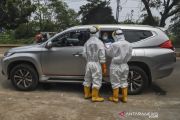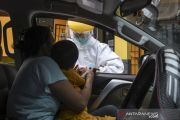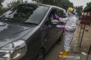Petugas Dinas Kesehatan Kota Depok memeriksa suhu pengendra mobil saat tes cepat (rapid test) pendektesian COVID-19 dengan sistem "drive-thru" di Cimanggis, Depok, Jawa Barat, Minggu (29/3/2020). Tes dengan sistem tersebut dilakukan guna mempercepat proses pemeriksaan dan mempersempit penyebaran penularan COVID-19 di wilayah Depok dan sekitarnya. ANTARA FOTO/Muhammad Adimaja/pras.