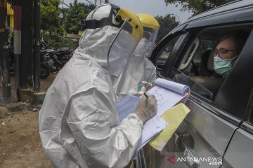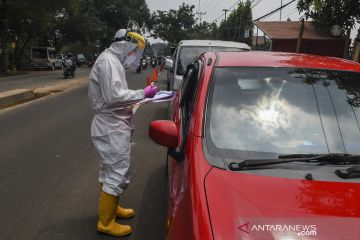 Petugas Dinas Kesehatan Kota Depok melakukan pengecekan kepada pengguna kendaraan saat tes cepat (rapid test) COVID-19 dengan sistem "drive thru" di Cimanggis, Depok, Jawa Barat, Minggu (29/3/2020). Tes dengan sistem tersebut dilakukan guna mempercepat proses pemeriksaan dan mempersempit penyebaran penularan COVID-19 di wilayah Depok dan sekitarnya. ANTARA FOTO/Muhammad Adimaja/pras.