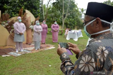 Tamu mengenakan masker saat menghadiri akad nikah pasangan suami-isteri Bayu Amde Winata dan Mike Agnesia yang berlangsung saat tanggap darurat COVID-19 di Kota Pekanbaru, Riau, Sabtu (4/4/2020). Pemerintah Indonesia mengimbau warga yang menikah untuk tidak mengumpulkan orang banyak, menyediakan masker dan pembersih tangan dan lokasinya di tempat terbuka serta menjaga pembatasan jarak fisik, agar tidak mempercepat penyebaran virus Corona. ANTARA FOTO/FB Anggoro/wsj.