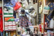 Seorang tukang cukur mengunakan alat pelindung diri (APD) saat mencukur rambut pelanggannya di tempat pangkas rambut Chemot Barbershop, Ciawi, Bogor, Jawa Barat, Sabtu (4/4/2020). Penggunaan APD tersebut merupakan sosialisasi kepada pelanggan serta sebagai antisipasi agar lebih waspada terhadap penularan COVID-19. ANTARA FOTO/Yulius Satria Wijaya/hp.