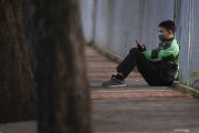 Pengemudi ojek daring menunggu pesanan di kawasan Tanah Kusir, Jakarta, Selasa (7/4/2020). Berlakunya Pembatasan Sosial Berskala Besar (PSBB) di wilayah DKI Jakarta mulai Selasa, 7 April 2020, pemerintah melarang transportasi daring khususnya sepeda motor untuk mengangkut penumpang. ANTARA FOTO/Puspa Perwitasari/wsj.