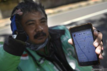 Pengemudi ojek daring menunjukkan layar aplikasi saat menunggu pesanan di Jakarta, Selasa (7/4/2020). Berlakunya Pembatasan Sosial Berskala Besar (PSBB) di wilayah DKI Jakarta mulai Selasa, 7 April 2020, pemerintah melarang transportasi daring khususnya sepeda motor untuk mengangkut penumpang. ANTARA FOTO/Puspa Perwitasari/wsj.
