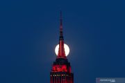 Bulan purnama (Supermoon) terlihat dibelakang gedung Empire State menyala merah bersamaan dengan mewabahnya virus corona (COVID-19) yang sedang melanda di wilayah Manhattan, New York City, di lihat dari Hoboken, New Jersey, AS, Selasa (7/4/2020). ANTARA FOTO/Reuters- Eduardo Munoz