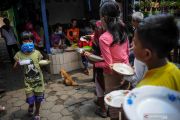 Warga antre untuk mendapatkan makan siang gratis di Lio Genteng, Astana Anyar, Bandung, Jawa Barat, Jumat (10/4/2020). Pembagian makan gratis hasil swadaya masyarakat itu ditujukan sebagai bentuk kepedulian terhadap warga terdampak COVID-19 yang kehilangan mata pencahariannya. ANTARA FOTO/Raisan Al Farisi/aww.