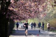 Orang-orang berjalan di bawah bunga sakura yang sedang mekar di sebuah taman di distrik Treptow di Berlin pada hari Minggu Paskah di tengah wabah (COVID-19), di Jerman, 12 April 2020. ANTARA FOTO/REUTERS / Michele Tantussi/aww.