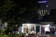 Warga Rawa Bambu beraktivitas di rumahnya dengan latar belakang lampu hotel berbentuk lafaz Allah di Jakarta Selatan, Minggu (12/4/2020). Gubernur DKI Jakarta Anies Baswedan mengimbau seluruh warga di Jakarta untuk tetap berada di rumah selama penerapan Pembatasan Sosial Berskala Besar (PSBB) guna memangkas mata rantai penyebaran COVID-19. ANTARA FOTO/Sigid Kurniawan/aww.
