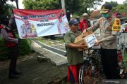 Petugas kepolisian memberikan sembako kepada pengayuh becak di wilayah Slawi, Kabupaten Tegal, Jawa Tengah, Rabu (15/4/2020). Pembagian paket sembako oleh Polres Tegal kepada ojek daring, juru parkir dan warga kurang mampu tersebut untuk membantu meringankan beban masyarakat yang terdampak COVID-19. ANTARA FOTO/Oky Lukmansyah/hp.