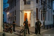 Sejumlah petugas keamanan dari Dinas Pariwisata Kota Semarang berjaga untuk memastikan tidak ada kerumunan massa atau kunjungan wisatawan guna mencegah penyebaran virus Corona (COVID-19) di Kawasan Kota Lama Semarang, Jawa Tengah, Jumat (17/4/2020). Selama masa pandemi COVID-19, kawasan cagar budaya dengan julukan âLittle Netherlandâ (Kota Belanda Kecil) yang menjadi tujuan utama wisata di Kota Semarang itu sepi pengunjung. ANTARA FOTO/Aji Styawan/hp.