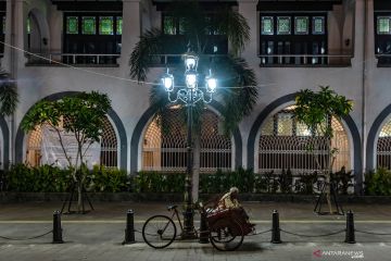 Suasana di sekitar gedung eks-perusahaan dagang Nederlandsche Handel Maatschappij (NHM) yang sepi saat menjelang senja di Kawasan Kota Lama Semarang, Jawa Tengah, Jumat (17/4/2020). Selama masa pandemi COVID-19, kawasan cagar budaya dengan julukan âLittle Netherlandâ (Kota Belanda Kecil) yang menjadi tujuan utama wisata di Kota Semarang itu sepi pengunjung. ANTARA FOTO/Aji Styawan/hp.