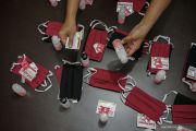 Anggota Pewarta Foto Indonesia (PFI) Pekanbaru menyusun cairan pencuci tangan, masker dan multivitamin yang akan dibagikan kepada sejumlah pewarta foto yang masih melakukan tugas jurnalistik di Pekanbaru, Riau, Sabtu (18/4/2020). Bantuan yang merupakan kerjasama antara Pewarta Foto Indonesia pusat dengan BNI, Smartfren, XL Axiata dan April Group ini dibagikan kepada anggota PFI di 16 kota di Indonesia untuk menjaga kesehatan saat meliput COVID-19. ANTARA FOTO/Rony Muharrman/hp.