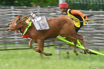 Joki memacu sapi saat latihan karapan sapi di Desa Durbuk, Pamekasan, Jawa Timur, Minggu (19/4/2020). Latihan tersebut merupakan uji coba terakhir menjelang bulan puasa dan dilaksanakan kembali pada pertengahan bulan Ramadan. ANTARA FOTO/Saiful Bahri/aww.