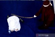 Terpidana pelanggar hukum syariat Islam dieksekusi cambuk di Banda Aceh, Aceh, Selasa (21/4/2020). Enam terpidana pelanggar peraturan daerah (qanun) nomor 6/2020 tentang hukum jinayat tetap di eksekusi cambuk ditengah darurat pandemi COVID-19 dengan menjaga jarak sosial (phsycal distancing) dan prosedur kesehatan. ANTARA FOTO/Irwansyah Putra/pras.