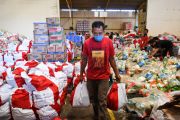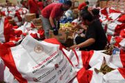 Pekerja mengemas paket bantuan sosial (bansos) di Gudang Food Station Cipinang, Jakarta, Rabu (22/4/2020). Pemerintah menyalurkan paket bansos masing-masing sebesar Rp600 ribu per bulan selama tiga bulan sebagai upaya untuk mencegah warga tidak mudik dan meningkatkan daya beli selama pandemi COVID-19 kepada warga yang membutuhkan di wilayah Jabodetabek. ANTARA FOTO/M Risyal Hidayat/wsj.