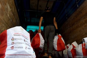 Pekerja memindahkan paket bantuan sosial (bansos) yang akan disalurkan di Gudang Food Station Cipinang, Jakarta, Rabu (22/4/2020). Pemerintah menyalurkan paket bansos masing-masing sebesar Rp600 ribu per bulan selama tiga bulan sebagai upaya untuk mencegah warga tidak mudik dan meningkatkan daya beli selama pandemi COVID-19 kepada warga yang membutuhkan di wilayah Jabodetabek. ANTARA FOTO/M Risyal Hidayat/wsj.