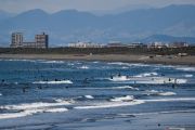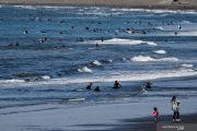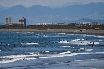 Sejumlah warga bermain selancar dan beraktivitas di pantai Katase Kaigan, meski pemerintah setempat telah mengimbau warga untuk menjalankan kebijakan social distancing dalam masa wabah COVID-19 yang masih berkelanjutan, kawasan selatan Tokyo, Jepang, Kamis (23/4/2020). ANTARA FOTO/REUTERS/Issei Kato/foc.