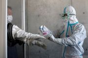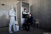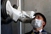 Seorang pekerja medis melakukan tes pelatihan walk-in style polymerase chain reaction (PCR) untuk penyakit virus corona (COVID-19), di fasilitas darurat di Yokosuka, Tokyo Selatan, Jepang, Kamis (23/4/2020). ANTARA FOTO/Reuters-Issei Kato/hp.