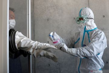 Seorang pekerja medis melakukan simulasi untuk uji walk-in style polymerase chain reaction (PCR) untuk penyakit virus corona (COVID-19), di fasilitas darurat di Yokosuka, Tokyo Selatan, Jepang, Kamis *23/4/2020). ANTARA FOTO/Reueters-Issei Kato/hp.