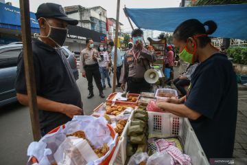 Petugas gabungan menginformasikan tentang peraturan berdagang selama PSBB kepada para pedagang makanan untuk berbuka puasa (takjil) di kawasan Bendungan Hilir, Jakarta, Jumat (24/4/2020). Pemprov DKI mengizinkan pedagang makanan dan minuman di kawasan tersebut untuk menjual takjil selama bulan Ramadhan dengan ketentuan tetap mengikuti aturan Pembatasan Sosial Berskala Besar (PSBB). ANTARA FOTO/Rivan Awal Lingga/foc.