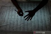 Perajin menebalkan pola untuk membuat batik motif ayat Al Quran di Mahkota Batik Laweyan, Solo, Jawa Tengah, Senin (27/4/2020). Pemilik usaha batik setempat mengaku telah menyelesaikan mushaf Al Quran sebanyak 30 juz lembaran batik bermotif ayat Al Quran. Pemilik usaha juga mengajak masyarakat untuk belajar menulis, membaca dan memahami Al Quran. ANTARA FOTO/Maulana Surya/pras.