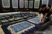 Perajin menunjukkan lembaran batik motif ayat Al Quran di Mahkota Batik Laweyan, Solo, Jawa Tengah, Senin,(27/4/2020). Pemilik usaha batik setempat mengaku telah menyelesaikan mushaf Al Quran sebanyak 30 juz lembaran batik bermotif ayat Al Quran. Pemilik usaha juga mengajak masyarakat untuk belajar menulis, membaca dan memahami Al Quran. ANTARA FOTO/Maulana Surya/pras.