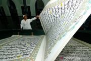 Seorang umat Islam membalik halaman saat tadarus Al Quran raksasa di Masjid Baiturrahman, Banyuwangi, Jawa Timur, Senin (27/4/2020). Al Quran raksasa tulisan tangan H Abdul Karim berukuran halaman 142 x 210 centimeter tersebut mulai ditulis pada 1 Februari 2010 dan selesai pada 26 Agustus 2010 untuk dibaca setiap bulan Ramadhan di Masjid Baiturrahman Banyuwangi. ANTARA FOTO/Budi Candra Setya/aww.