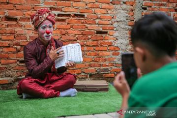 Yahya Edward menggunakan kostum badut melakukan siaran langsung kegiatan belajar ngaji di Pinang, Kota Tangerang, Banten, Selasa (28/4/2020). Sejak diberlakukannya Pembatasan Sosial Berskala Besar (PSBB), badut tersebut tetap mengajar mengaji via dalam jaringan setelah sebelumnya mengajar di yayasan dengan menggunakan kostum badut. ANTARA FOTO/Fauzan/pras.