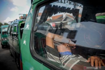Seorang sopir angkot tertidur di dalam kendaraannya di Terminal Cicaheum, Bandung, Jawa Barat, Rabu (29/4/2020). Pemerintah Provinsi Jawa Barat berencana menghentikan sementara operasional angkutan perkotaan di wilayah yang sedang menerapkan Pembatasan Sosial Berskala Besar (PSBB) guna menekan angka kasus pasien positif COVID-19 di Bandung Raya. ANTARA FOTO/Raisan Al Farisi/hp.