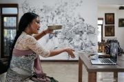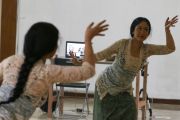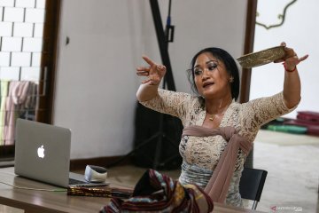 Guru tari mengajarkan tari Bali di sebuah sanggar di kawasan Ampera, Jakarta, Sabtu (2/5/2020). Di tengah penerapan Pembatasan Sosial Berskala Besar (PSBB) akibat pandemi COVID-19, guru tari di sanggar tersebut mengajarkan tari secara daring. ANTARA FOTO/Rivan Awal Lingga/wsj.