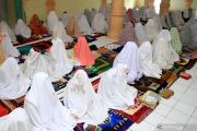 Jamaah Suluk menutupi kepalanya dengan mukena atau selendang saat mengikuti zikir, tahlil dan shalawat di Kompleks Pondok Pesantren Babussalam, Meulaboh, Aceh Barat, Aceh, Sabtu (2/5/2020). Aktivitas Suluk atau menempuh jalan spiritual menuju Allah SWT yang berlangsung selama bulan suci Ramadhan tersebut bertujuan untuk membersihkan hati, menyucikan jiwa dan memohon ampunan sekaligus mendekatkan diri kepada Yang Maha Kuasa. ANTARA FOTO/Syifa Yulinnas/wsj.