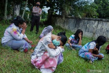 Polisi memberikan arahan ke sejumlah pelajar SMA yang terjaring razia saat melakukan perayaan kelulusan UN di kawasan kota Palangkaraya, Kalimantan Tengah, Minggu (3/5/2020). Personel Polda Kalteng membubarkan perayaan kelulusan tersebut dengan memberikan hukuman push-up dan mengimbau ke pelajar untuk tetap di rumah masing-masing guna mencegah penyebaran COVID-19. ANTARA FOTO/Makna Zaezar/aww.