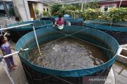 Pekerja memberi pakan ikan lele yang dibudidayakan dengan sistem bioflok di Desa Ilie, Banda Aceh, Aceh, Minggu (3/5/2020). Jumlah usaha budidaya ikan lele dan ikan air tawar dengan sistem bioflok terus meningkat di wilayah perkotaan karena mampu menghasilkan ikan yang higienis, hemat pakan, masa panen yang teratur dan ramah lingkungan. ANTARA FOTO/Irwansyah Putra/aww.