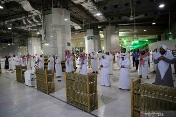 Jamaah menunaikan shalat di dekat Kabah di Masjidil Haram sambil mempraktikkan jarak sosial, setelah merebaknya COVID-19, selama bulan suci Ramadhan di Kota Suci Mekah, Arab Saudi, Senin (4/5/2020). ANTARA FOTO/Saudi Press Agency/Handout via REUTERS/wsj.