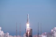 Roket pengangkut berkapasitas besar baru milik China, Long March-5B, lepas landas dari Pusat Peluncuran Antariksa Wenchang di Provinsi Hainan, China selatan, Selasa (5/5/2020). Long March-5B melakukan penerbangan perdananya pada Selasa (5/5) kemaren, mengirimkan versi uji coba wahana luar angkasa berawak generasi baru China dan kapsul pengembalian kargo untuk pengujian di luar angkasa. ANTARA FOTO/Xinhua-Zhao Yingquan/hp.