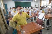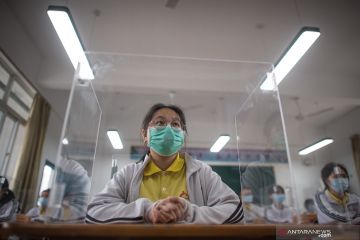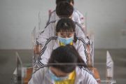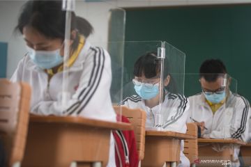 Para siswa sekolah menengah atas (SMA) tingkat akhir belajar di sebuah kelas dengan papan transparan dipasang di masing-masing meja untuk memisahkan setiap siswa sebagai langkah pencegahan penyebaran COVID-19 di Sekolah Menengah No. 23 Wuhan di Wuhan, Provinsi Hubei, China tengah, Rabu (6/5/2020). Sekitar 57.800 siswa tingkat akhir dari 121 sekolah menengah atas dan kejuruan kembali bersekolah pada Rabu (6/5) di Wuhan, ibu kota Provinsi Hubei, China tengah, yang sebelumnya terdampak parah oleh wabah COVID-19. ANTARA FOTO/Xinhua-Xiao Yijiu/hp.