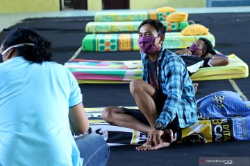 Pemudik melakukan karantina di Gelanggang Olah Raga (GOR) Tawangalun Banyuwangi, Jawa Timur, Kamis (7/5/2020). Pemudik yang dikarantina dan terdata oleh Gugus Tugas Penanganan COVID-19 di GOR Tawangalun, selanjutnya akan dilaporakan ke perangkat daerah asalnya untuk dilakukan penjemputan dan pengawasan saat karantina mandiri di daerahnya. ANTARA FOTO/Budi Candra Setya/hp.