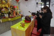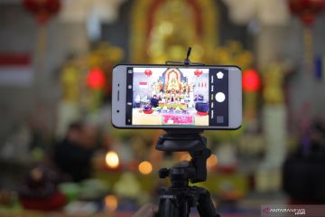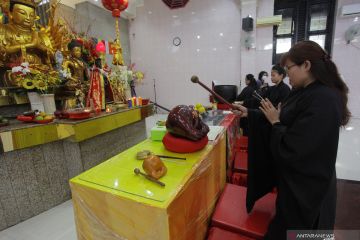 Pemuka agama melaksanakan ibadah perayaan hari raya Waisak 2020 secara online di Vihara Avalokitesvara Kwan Im Tong 95, Jakarta, Kamis, (7/5/2020). Dalam masa PSBB sejumlah umat Buddha terpaksa harus melaksanakan ibadah perayaan Waisak 2020 secara online. ANTARA FOTO/Reno Esnir/hp.