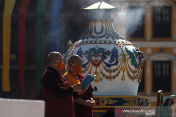 Sejumlah biksu mengenakan masker pelindung wajah saat berdoa di Stupa Boudhanath sebagai ritual perayaan kelahiran Budha, yang juga dikenal sebagai Hari Waisak, di tengah masa karantina wilayah untuk mencega penyebaran penyakit virus corona (COVID-19) yang diberlakukan oleh pemerintah di Kathmandu, Nepal (7/5/2020). ANTARA/REUTERS/Navesh Chitrakar/aa.