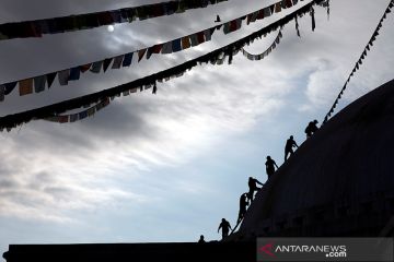 Sejumlah warga mendaki kubah Stupa Boudhanath untuk melakukan ritual perayaan kelahiran Budha, yang juga dikenal sebagai Hari Waisak, di tengah masa karantina wilayah untuk mencega penyebaran penyakit virus corona (COVID-19) yang diberlakukan oleh pemerintah di Kathmandu, Nepal (7/5/2020). ANTARA/REUTERS/Navesh Chitrakar/aa.