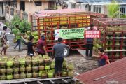 Sejumlah buruh membongkar muat gas Elpiji 3 Kg ke dalam kapal di Pelabuhan Rakyat Sungai Dumai, di Dumai, Riau, Jumat (8/5/2020). Memasuki pekan ketiga bulan Ramadhan, distribusi kebutuhan pokok untuk lebaran dari Dumai ke pulau terluar seperti Pulau Rupat menggunakan kapal laut sudah mulai menunjukkan adanya peningkatan. ANTARA FOTO/Aswaddy Hamid/foc.
