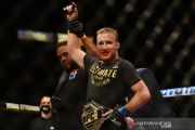 Justin Gaethje mengenakan sabuk juara usai mengalahkan Tony Ferguson pada laga UFC 249 di VyStar Veterans Memorial Arena, Jacksonville, Florida, AS, 9 Mei 2020. ANTARA FOTO/Jasen Vinlove-USA TODAY Sports via Reuters/aww.