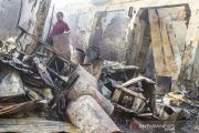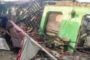 Pedagang membersihkan kiosnya pascakebakaran di Pasar Simpang Jomin, Kota Baru, Karawang, Jawa Barat, Senin (11/5/2020). Kebakaran yang terjadi pada Senin (11/5) dini hari itu menghanguskan enam bangunan kios yang diduga disebabkan hubungan arus pendek listrik. ANTARA FOTO/M Ibnu Chazar/pras.