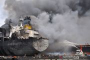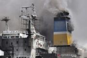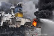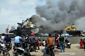 Kapal tanker MT JAG LEELA terbakar di Pelabuhan Belawan Medan, Sumatera Utara, Senin (11/5/2020). Penyebab terbakarnya kapal tanker MT JAG LEELA yang sedang dalam perawatan atau 'docking' di galangan kapal milik PT Waruna Nusa Sentana Shipyard tersebut belum diketahui dan masih diselidiki. ANTARA FOTO/Septianda Perdana/pras.