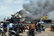 Sejumlah warga melihat terbakarnya kapal tanker MT JAG LEELA di Pelabuhan Belawan Medan, Sumatera Utara, Senin (11/5/2020). Penyebab terbakarnya kapal tanker MT JAG LEELA yang sedang dalam perawatan atau 'docking' di galangan kapal milik PT Waruna Nusa Sentana Shipyard tersebut belum diketahui dan masih diselidiki. ANTARA FOTO/Septianda Perdana/pras.