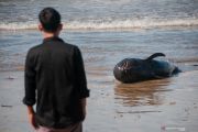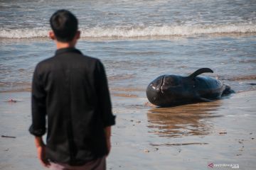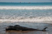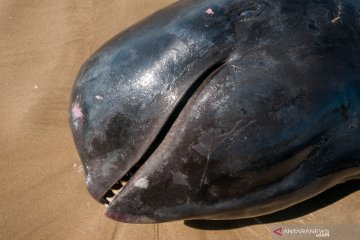Bangkai seekor paus pilot tergeletak di Pantai Cemara Binuangeun, Lebak, Banten, Selasa (12/5/2020). Menurut keterangan warga setempat paus pilot dengan panjang sekitar dua meter tersebut terseret ombak hingga akhirnya terdampar di bibir pantai dan mati sejak sejak Senin (11/5) dini hari. ANTARA FOTO/Muhammad Bagus Khoirunas/wsj.