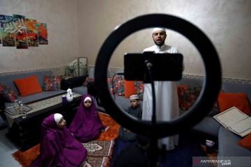Anak-anak dari Imam Yordania Ahmad al Harasis membaca ayat suci Al Quran sebelum menunaikan shalat tarawih di rumahnya di tengah merebaknya COVID-19 di Amman, Yordania, Senin (11/5/2020). Pemerintah Yordania mengimbau warga muslim Yordania untuk tetap beribadah di rumah saja selama bulan suci Ramadhan karena sedang terjadi wabah virus Corona. ANTARA FOTO/REUTERS/Muhammad Hamed/wsj.