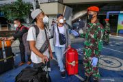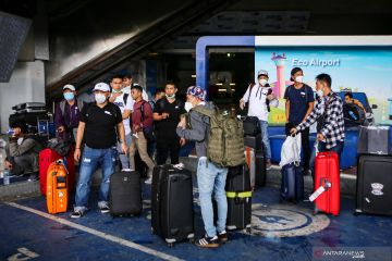 Sejumlah Warga Negara Indonesia (WNI) yang menjadi anak buah kapal Royal Caribbean tiba di Terminal 3 Bandara Internasional Soekarno Hatta, Tangerang, Banten, Rabu (13/5/2020). Sebanyak 225 WNI ABK kapal pesiar tersebut menjalani serangkaian tes kesehatan sesuai protokol pencegahan COVID-19 seperti rapid test, sebelum dibawa menuju asrama haji Pondok Gede untuk menjalani karantina. ANTARA FOTO/Fauzan/wsj.