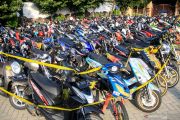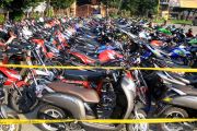 Ratusan kendaraan bermotor milik warga yang terjaring razia terparkir di halaman Polresta Sidoarjo, Jawa Timur, Minggu (17/5/2020). Kepolisian Resor Kota Sidoarjo Jawa Timur berhasil mengamankan 224 kendaraan bermotor yang diduga digunakan saat balap liar motor di akses jalan exit tol porong saat pemberlakuan pembatasan sosial berskala besar (PSBB) dan melakukan pembinaan terhadap 500 pemuda yang turut terjaring dalam razia itu agar tidak mengulangi perbuatannya. ANTARA FOTO/Umarul Faruq/foc.