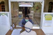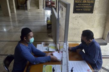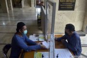 Umat Islam menunaikan pembayaran zakat fitrah di Masjid At-Taqwa Polda Bali, Denpasar, Bali, Minggu (17/5/2020). Panitia zakat setempat menerapkan jarak sosial (physical distancing) dalam layanan penerimaan zakat fitrah dengan memasang pembatas transparan serta menerima pembayaran zakat fitrah dengan metode nontunai melalui rekening bank sebagai upaya pencegahan penyebaran COVID-19. ANTARA FOTO/Fikri Yusuf/aww.